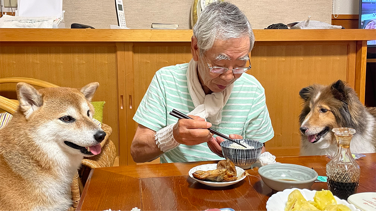 大好きなおじいちゃんのご飯がおいしそうでじーっと見つめています?