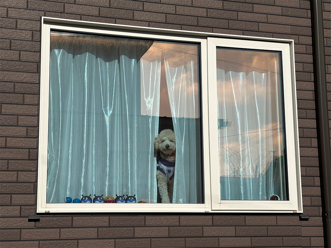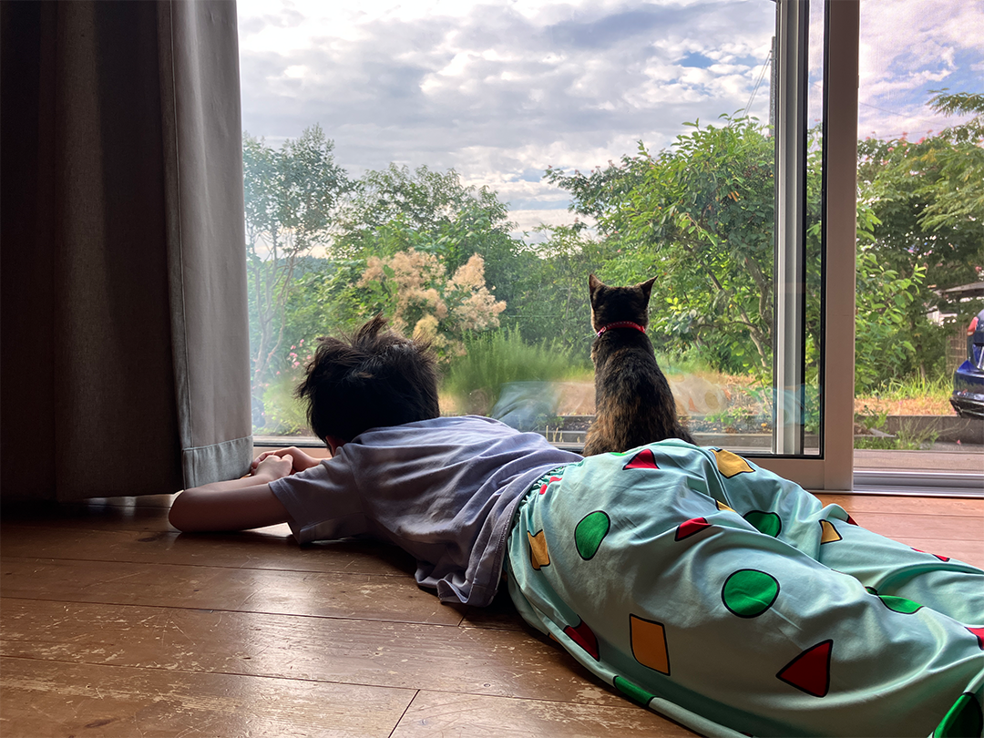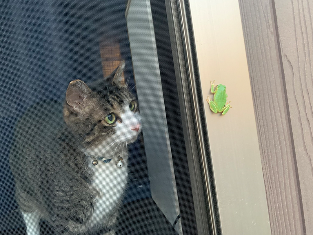 我が家の猫、かつお君。窓の外に新しいお友達発見!!
