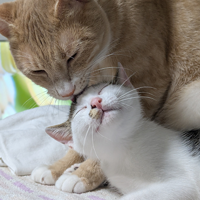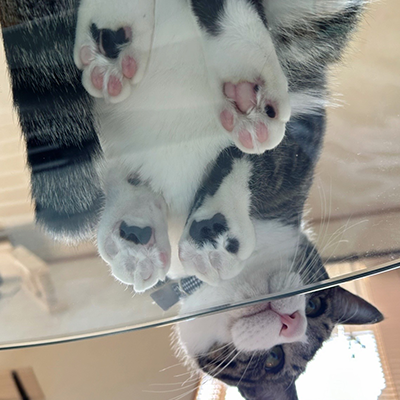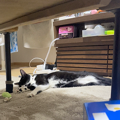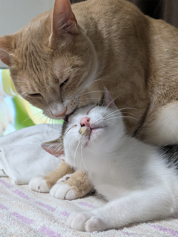 やっと自分の家だと思ってくれるようになったかな?ヘソ天スタイルで寝るのが好き、ダイニングテーブルの家族の膝の上に抱かれるのが好き。甘えん坊な女の子です。
